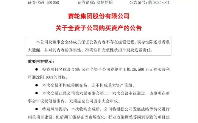 【炭黑產業網】7月15日消息,近日,輪胎行業迎來一則重磅收購消息。賽輪輪胎于7月14日對外披露,其全資子公司賽輪(沈陽)輪胎有限公司將斥資2.65億元,收購普利司通(中國)投資有限公司所持有的普利司通(沈陽)輪胎有限公司的全部股權,雙方已正式簽署《股權轉讓協議》。