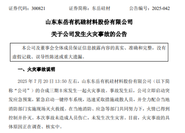 據(jù)炭黑產(chǎn)業(yè)網(wǎng)了解,作為國內(nèi)有機(jī)硅領(lǐng)域的重要企業(yè),東岳硅材自 2006 年成立以來,已在該領(lǐng)域積累十余年經(jīng)驗,2020 年在深交所創(chuàng)業(yè)板上市。其產(chǎn)品涵蓋硅橡膠、硅油等多種有機(jī)硅材料,廣泛應(yīng)用于建筑、醫(yī)療等多個行業(yè),在淄博的生產(chǎn)基地?fù)碛腥子袡C(jī)硅單體裝置,年產(chǎn)能達(dá) 60 萬噸,此次出事的合成三期車間占其中 30 萬噸產(chǎn)能,恰好是總產(chǎn)能的半數(shù)。