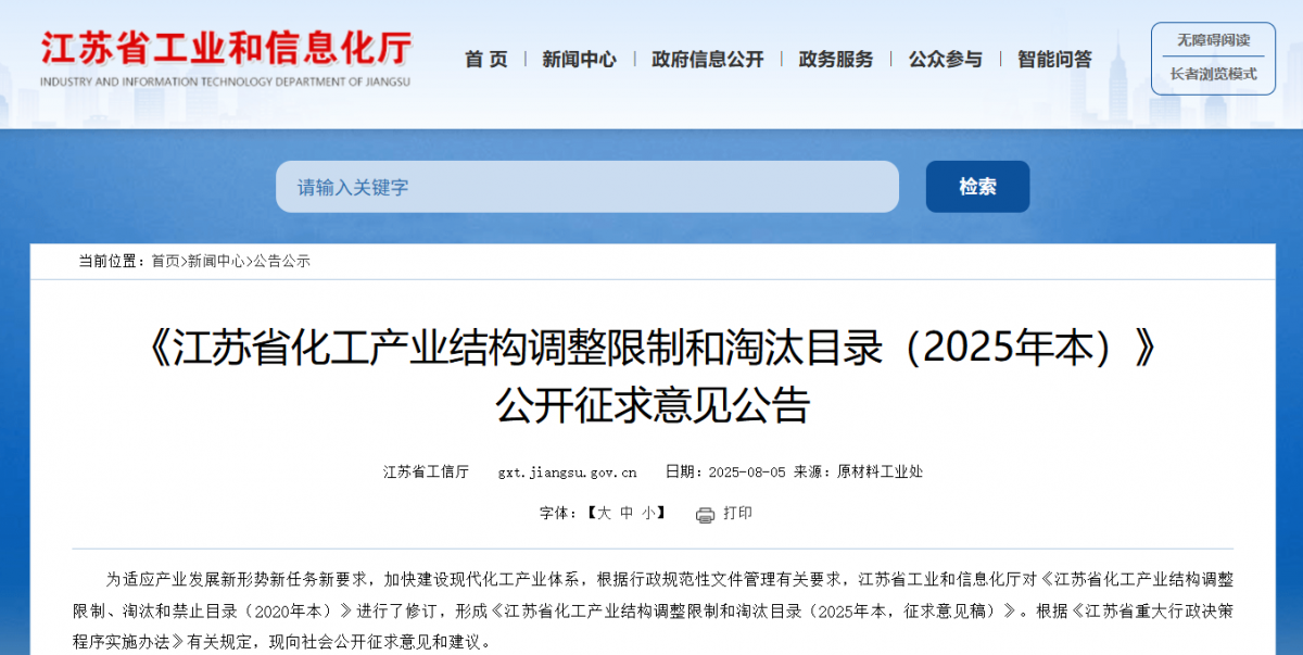 【炭黑產(chǎn)業(yè)網(wǎng)】8月7日消息,8月5日,江蘇省工業(yè)和信息化廳發(fā)布《江蘇省化工產(chǎn)業(yè)結(jié)構(gòu)調(diào)整限制和淘汰目錄(2025年本)》公開征求意見公告,其中: