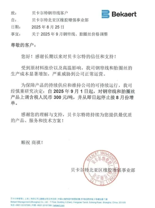 值得關注的是,在發布限產通知的同一時期,貝卡爾特北亞區橡膠增強事業部也向客戶發出另一份關鍵通知,宣布自 2025 年 9 月 1 日起,對鋼簾線和胎圈絲產品的含稅價格每噸上調 300 元,且從通知發布當日起停止接收 8 月份新增訂單。該通知函將調價原因直接指向 “原材料價格上漲及持續高溫天氣影響”,稱這些因素導致企業 “生產成本顯著攀升,運營壓力驟增”。這一表述清晰表明,貝卡爾特正嘗試通過價格調整機制,將上游傳導的成本壓力與自身面臨的運營風險部分轉移至下游客戶,從而保障公司產品供應的穩定性及長期健康運營。