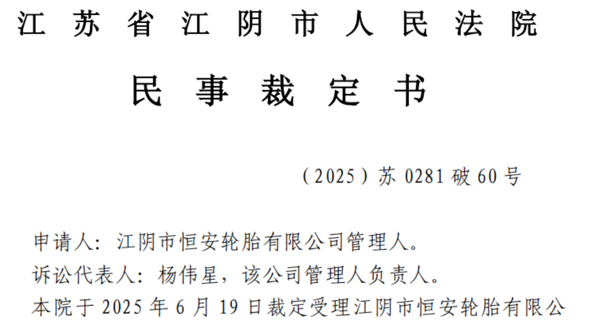 【炭黑產(chǎn)業(yè)網(wǎng)】10月28日消息,江蘇省江陰市人民法院近期對外公布一份民事裁定書,正式宣告江陰市恒安輪胎有限公司進入破產(chǎn)程序。這一裁定標志著該公司實際控制人劉燕明旗下的產(chǎn)業(yè)版圖再遭重創(chuàng),繼兩家關(guān)聯(lián)工廠陷入危機后,又一核心企業(yè)宣告隕落。