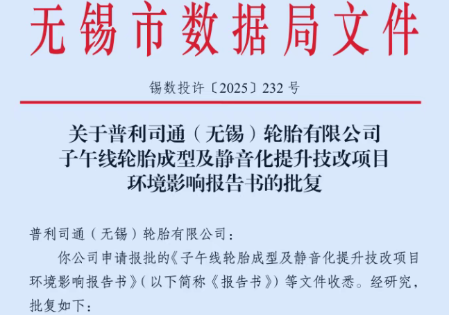 【炭黑產業網】11 月 10 日消息,普利司通(無錫)輪胎有限公司的 “子午線輪胎成型及靜音化提升技改項目” 于 2025 年 10 月 31 日正式取得無錫市數據局環保批復(批復文號:錫數投許〔2025〕232 號)。標志著該工廠在高端化升級與綠色化轉型的進程中實現關鍵突破,將通過技術革新進一步強化其在高端輪胎市場的競爭力。