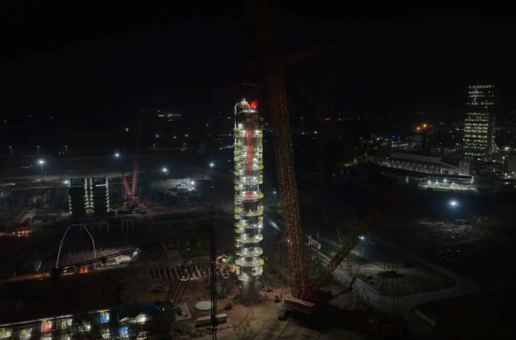 當日11時17分,吊裝作業正式啟動。在4000噸級履帶式起重機與1350噸級履帶式起重機的默契配合下,歷經約3個半小時,至14時40分,丙烯塔(Ⅰ)由水平狀態被成功吊至直立狀態。隨后,在19時17分,丙烯塔(Ⅰ)精準就位,標志著此次吊裝任務順利完成。