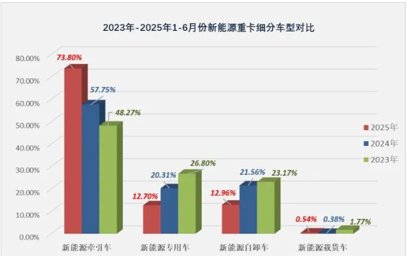 2025年6月份,新能源牽引車在新能源重卡市場占到77.68%的份額,較上月(72.95%)提升近5個百分點。今年1-6月,新能源牽引車在新能源重卡市場占到73.80%的份額,較2024年全年67.99%的占比明顯提升,與去年同期相比則提升了超16個百分點(如上圖)。根據第一商用車網的觀察, 2024年下半年,牽引車在新能源重卡單月銷量結構占比持續高位, 8-12月占比均超過70%,從這個角度看,今年上半年新能源牽引車市場顯然是延續了上年的良好勢頭(上半年有5個月占比都超過70%)。